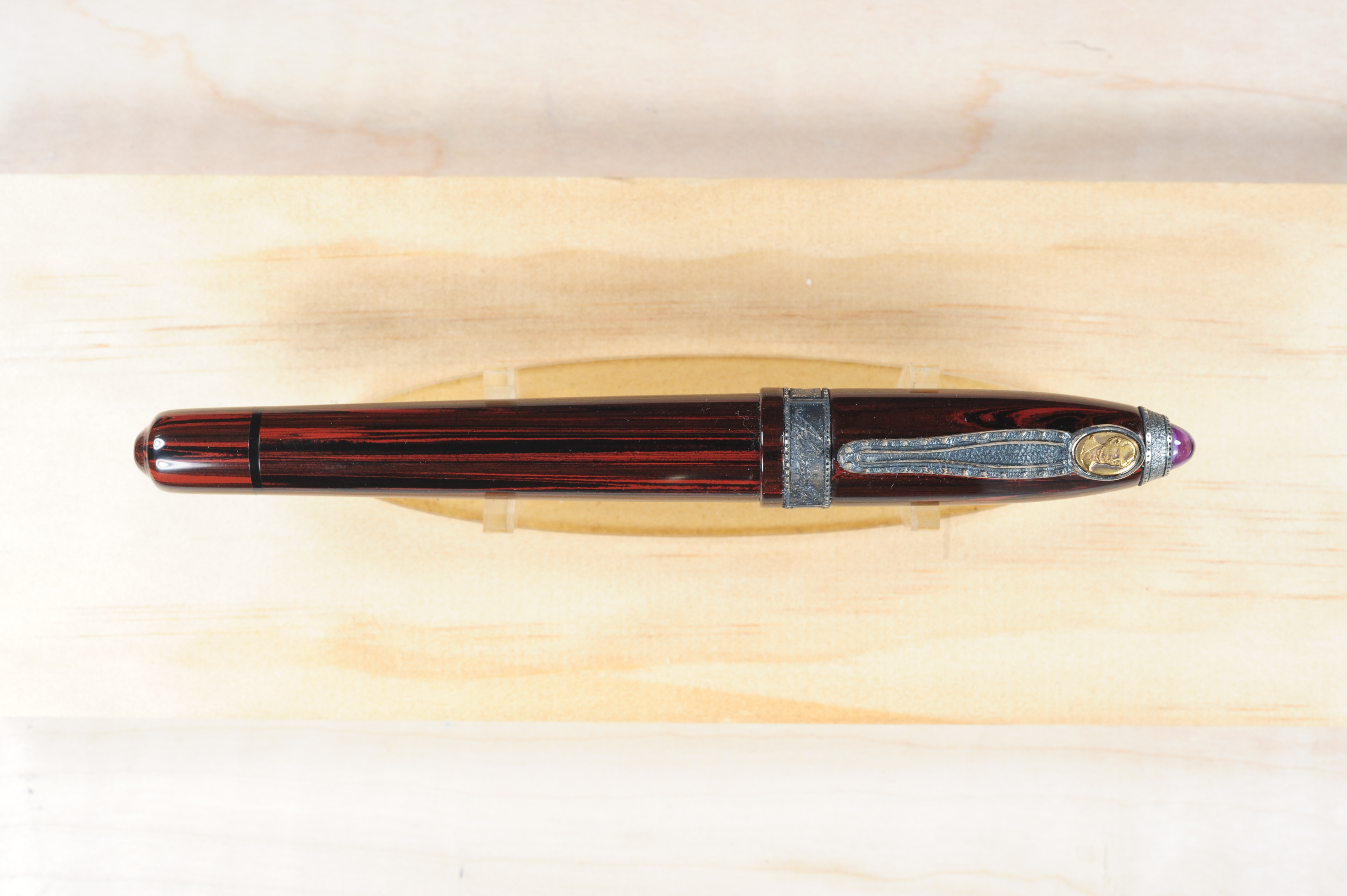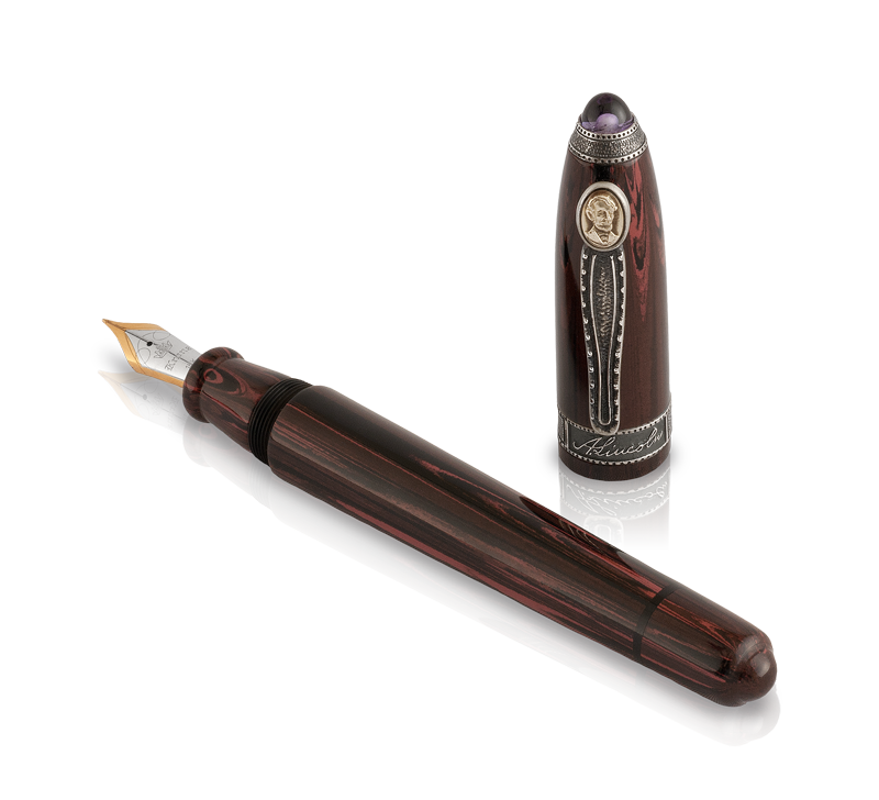 In addition to such technological achievements, the Krone Limited Edition Abraham Lincoln Pen is made by the finest craftsmen, who use the finest materials to create a writing instrument of unsurpassed quality and durability. Each Abraham Lincoln Pen contains: A two-toned, iridium-tipped 18kt.-gold nib, with the Krone name guilloched on the nib. The nibs are offered in three customized widths (fine, medium, and broad) in deference to the owner’s writing preference. An ergonomically designed ebonite barrel hand-tooled to conform to every curve in the hand, providing the ultimate in comfort, balance and fluidity. At the top of the cap, a .925-silver bezel, holding a cabochon amethyst contains the 16th President’s DNA in the form of porous glass powder obtained by the patented PCR process. Lincoln’s distinctive signature is engraved on a .925-silver band at the bottom of the cap. A .925-silver clip containing a small oval where the Abraham Lincoln portrait is engraved in 18kt.-gold. The Abraham Lincoln Pen is a limited edition of 1,008 pens in sterling silver worldwide. Each pen’s sequential number is engraved on the barrel, ensuring that this distinctive writing instrument will be the definitive historical collectible of all time. Piston Fill. F, M and B. From Krone's website